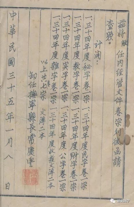 1946年1月8日,县长赵尚金(常庆丰)离任时移交档案清册(那个时候的档案由县长保管,县长离任需要移交档案!抚宁区档案馆保存的革命历史档案原件都是县长赵尚金保存下来的)