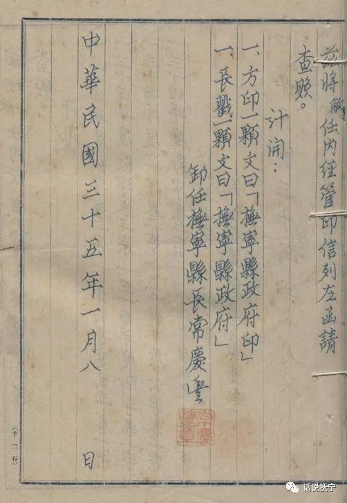 赵尚金离任时移交县政府大印的清册,那个时候县政府大印是县长拿着!