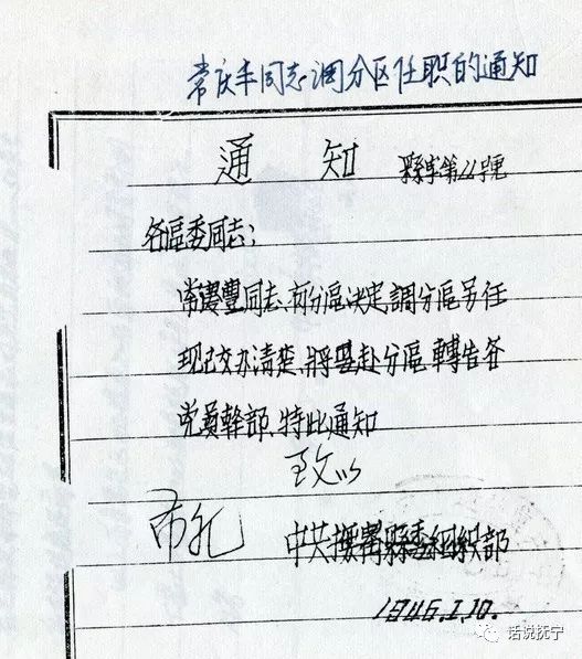 1946年1月10日,县长赵尚金调走后,县委组织部向全县各区委发出的通知。
