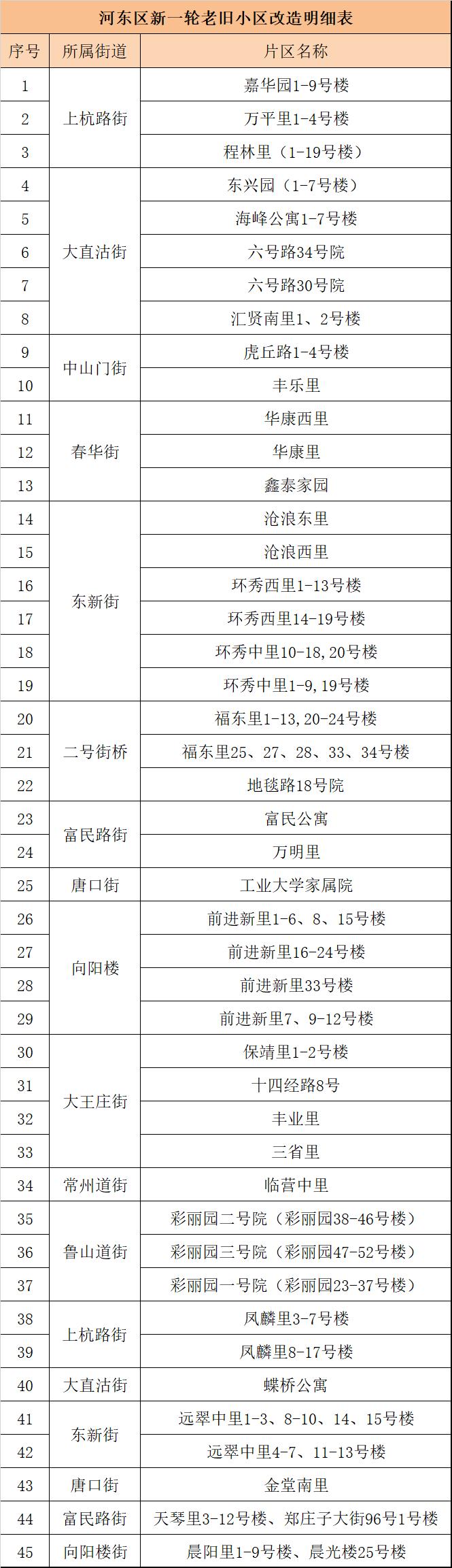 2020年底,河东区开展了以基础类、完善类和提升类三大类为主的新一轮老旧小区改造工作。此次改造涉及河东区12个街道的45个小区,建筑面积180.6万平米,惠及2.57万户居民。项目自2020年11月开工以来,科学组织,有序推进,计划2021年5月30日全部完工。