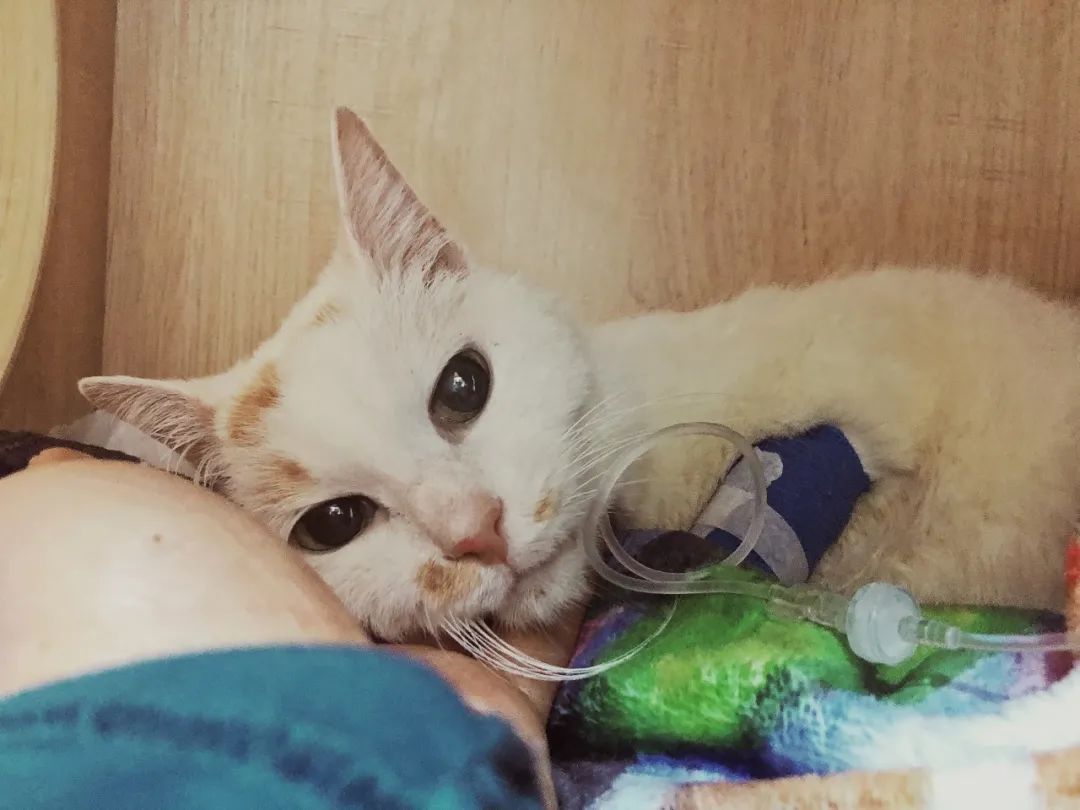 小猫被装在鞋盒里带去医院,医生用一根长长的针试探着插进猫的脚心:没有任何反应;再插进她的脚上:仍然没有反应;几次探测加上拍片,医生判断这只小猫已经高位截瘫了,就是说从此站不起来、无法自行排便、没有独立生存能力。