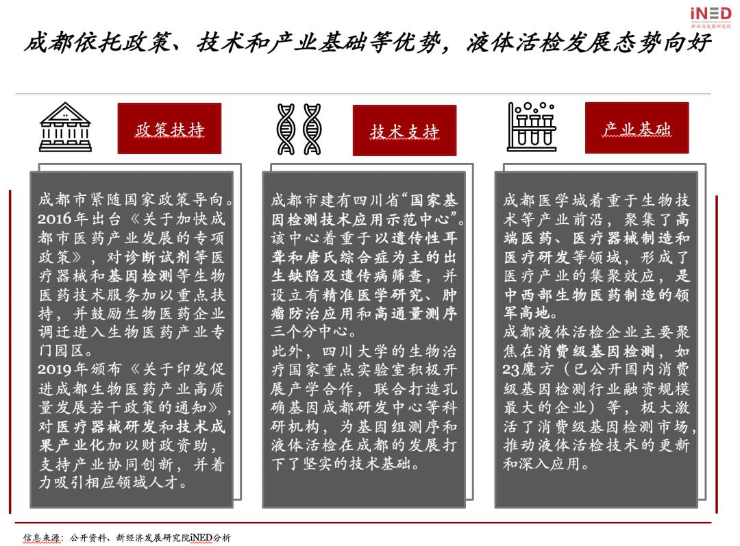 产业基础:成都医学城聚集了高端医药、医疗器械制造和医疗研发等产业,集聚效应明显,是中西部生物医药制造的领军高地。成都液体活检行业主要聚焦于基因检测,吸引了23魔方(已公开国内消费级基因检测行业融资规模最大)和诺瀚康(专注肿瘤易感基因筛查)等众多企业入驻,推动了消费级基因检测,利于液体活检的技术更新和应用拓展。