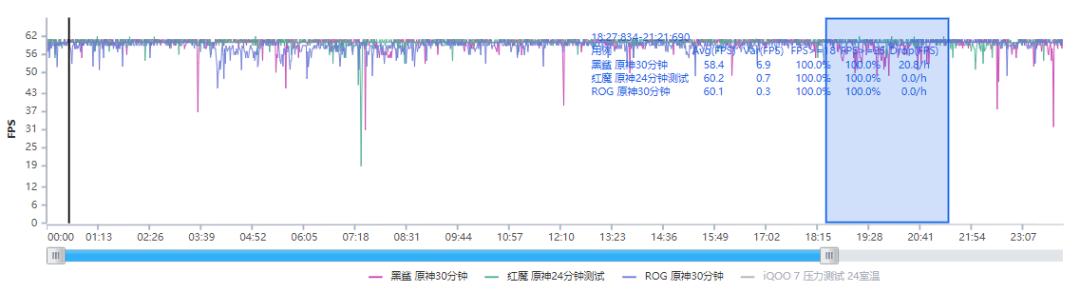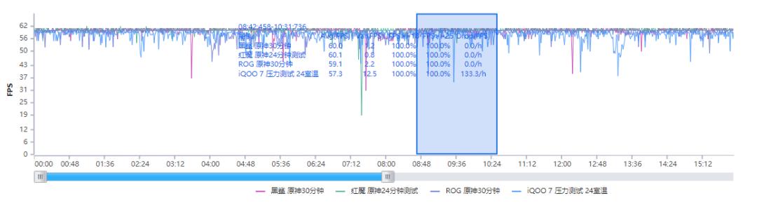 从帧率曲线上来看,不愧是术业有专攻,全程平均帧率都在 59 帧以上,显示亮度也没有任何降低。这可比普通手机表现稳太多了啊!