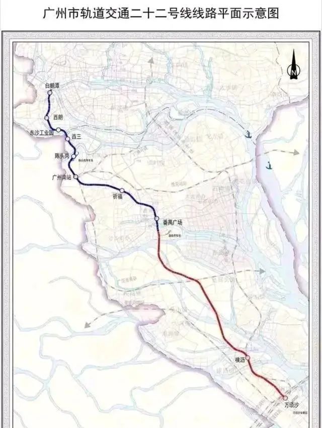 ○芳村至白云机场城际(广州地铁22号线北延线)长约40.2公里,设9座车站。线路从芳村北上,在彩虹桥设站,换乘在建的8、11、13号线。广州地铁18和22号线共同承担连通万顷沙、广州南站、广州东站、白鹅潭四大枢纽。