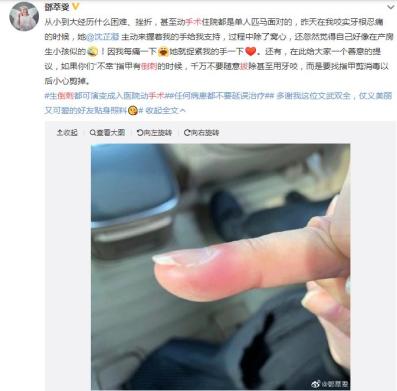 然而,不是上流君恐吓你们,随随便便拔倒刺,却可能随随便便进医院。搜一下新闻,因为拔倒刺进医院的事情比比皆是,前不久明星邓萃雯因为拔倒刺就弄到发炎,整个指头红肿,不得不住院治疗。