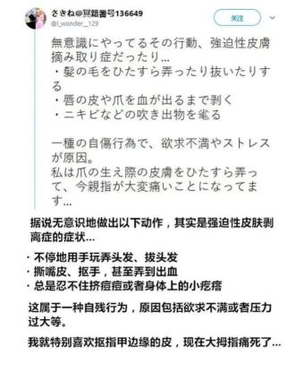 因抠痘痘、撕倒刺等习惯,遭受了严重的心理,身体或社会损害。