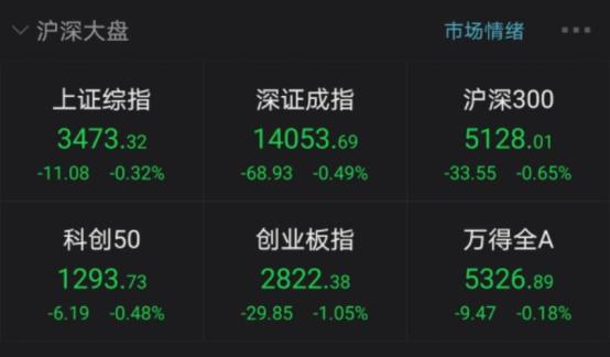 截至午间收盘,上证指数报3473.32点,下跌11.08点,下跌0.32%,成交额1864.62亿元;深证成指报14053.69点,下跌68.92点,下跌0.49%,成交额2420.21亿元,两市合计成交额4284.83亿元;创业板指报2822.38点,下跌29.85点,下跌1.05%,成交额825.91亿元。