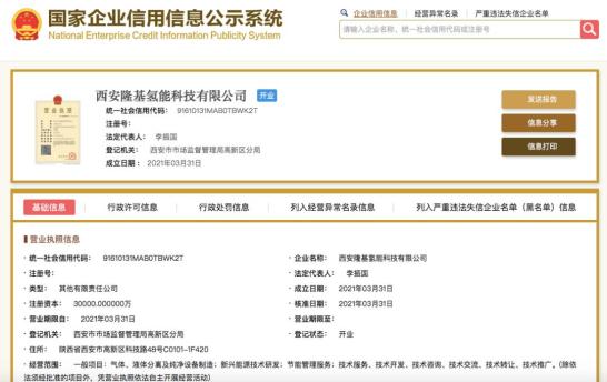 4月5日,据国家企业信用信息公示系统消息显示,西安隆基氢能科技有限公司于2021年3月31日注册成功。