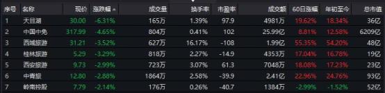 盘中,天目湖、首旅酒店、中国中免跌幅超过4%,西安旅游跌幅超过2%,其它多家公司也出现了不同程度下跌。