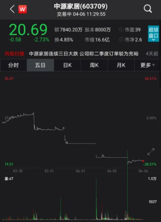 今天中源家居低开8%,连续4日大跌,疑似再现“杀猪盘”,截至午间收盘该股跌幅收窄至2.73%。
