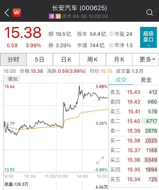 受消息扰动,长安汽车午后快速拉升,一度涨近5.88%,随后有所回落。截至收盘,该股涨约3.99%,报15.38元,最新总市值为744亿元,当日成交额超19.5亿元。