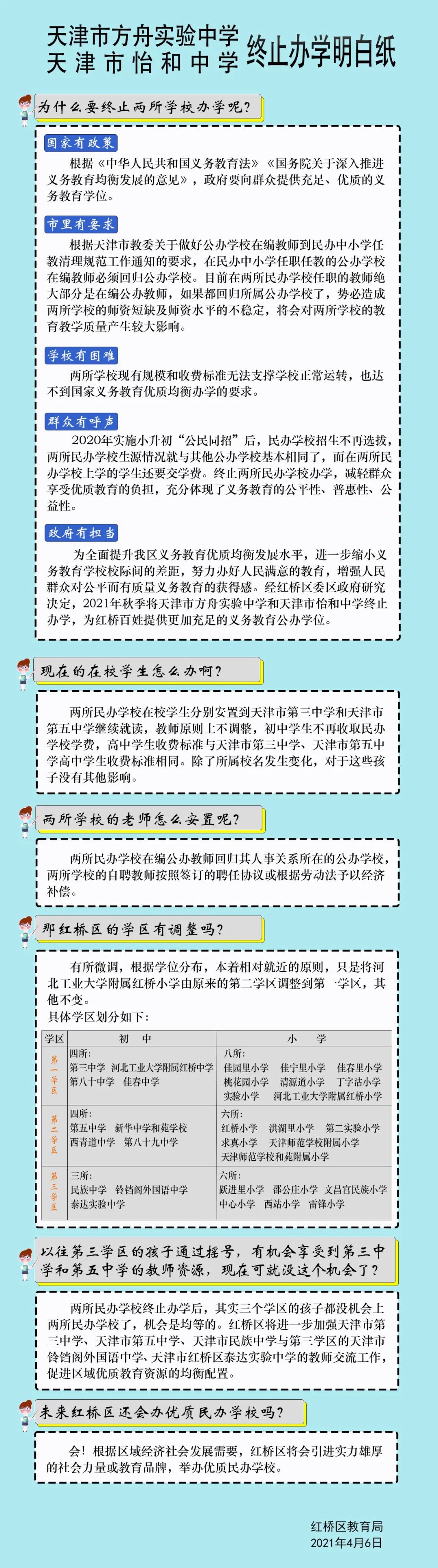 为全面提升我区义务教育优质均衡发展水平,进一步缩小义务教育区域、校际差距,为红桥百姓提供充足的公办学位,减轻群众享受优质教育的负担,增强人民群众对公平而有质量义务教育的获得感,根据《中华人民共和国义务教育法》《国务院关于深入推进义务教育均衡发展的意见》及天津市教委关于做好公办学校在编教师到民办中小学任教清理规范工作通知的要求,经红桥区委区政府研究决定,于2021年秋季将天津市方舟实验中学和天津市怡和中学终止办学。