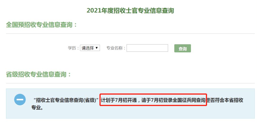 △ “招收士官专业信息查询(省级)”计划于7月初开通,请于7月初登录全国征兵网查询是否符合本省招收专业。