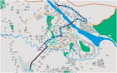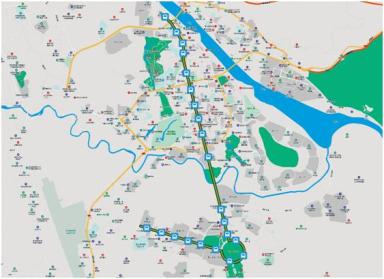 途经道路:机场路←→勐海路←→勐腊路←→勐泐大道←→宣慰大道←→新大桥←→澜沧江路←→景亮北路