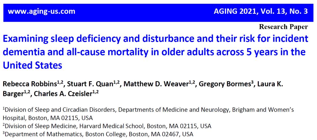 近日,哈佛大学医学院睡眠医学科、哈佛大学医学院附属布列根和妇女医院的研究人员在 Aging 期刊发表了一项题为:Examining sleep deficiency and disturbance and their risk for incident dementia and all-cause mortality in older adults across 5 years in the United States 的研究论文。