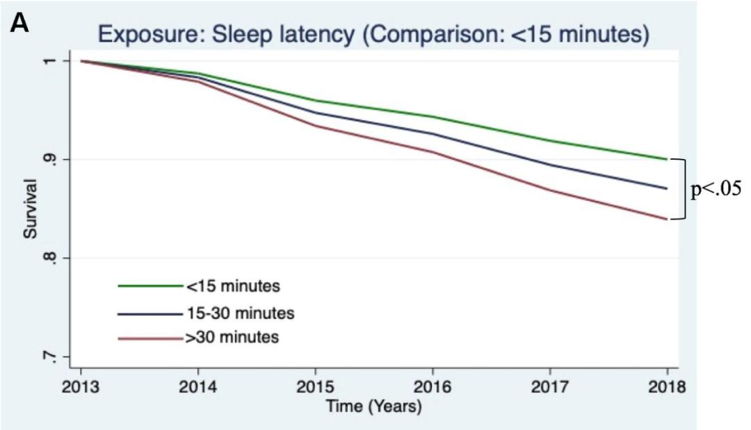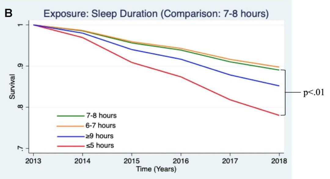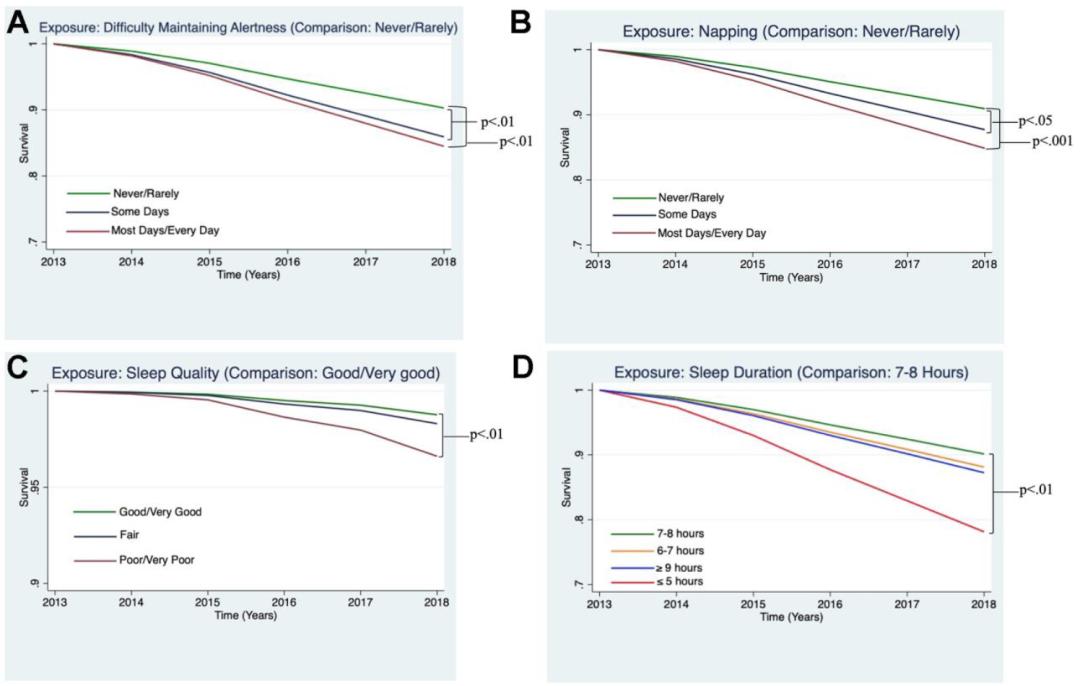 此外,该研究还发现,睡醒后低警觉性、经常打盹、睡眠质量差、每晚睡眠少于5小时均与全因死亡率有关,其中每晚睡眠时间少于5小时最为明显,与全因死亡风险增加138%有关。