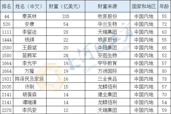其中,牧原股份的秦英林以335亿美元的财富值继续稳坐河南首富之位,全球排名第44位。这位“养猪大王”在中国上榜富豪中排名第九,次于曾经的亚洲首富李嘉诚(337亿美元,全球排名第43位)。