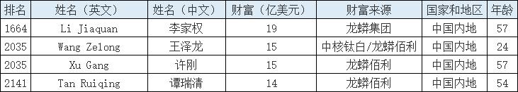值得注意的是,在此次全球富豪榜上,排在第1664位的李家权和与许刚并列排在第2035位的王泽龙,与龙蟒佰利也颇有渊源。