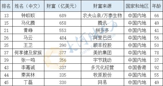 马化腾以658亿美元位列中国富豪榜第二,在全球排名第15位。拼多多创始人黄峥身家达553亿美元,位列全球第21位,成为榜单上排名第三的中国富豪。而去年的中国首富马云则在中国富豪中位列第4位,全球排名第26位,其财富值为484亿美元。