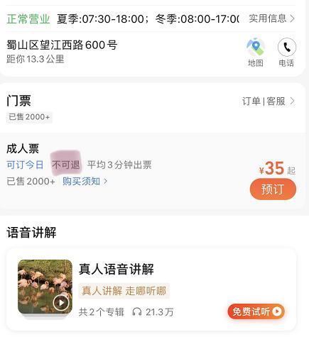 此外,记者还注意到在携程、高德等平台的购票页面,尽管单人票价为35元/人,但清楚注明“不可退换”;飞猪则标注“有条件退换”需收取手续费。在动物园微信公众号上有游客表示,4月4日在同程app上购入一张42元的单人票后,到现场却无法核验。联系后台退票被要求收取30%服务费,投诉无果后和动物园工作人员现场协商,最终才得以入园。