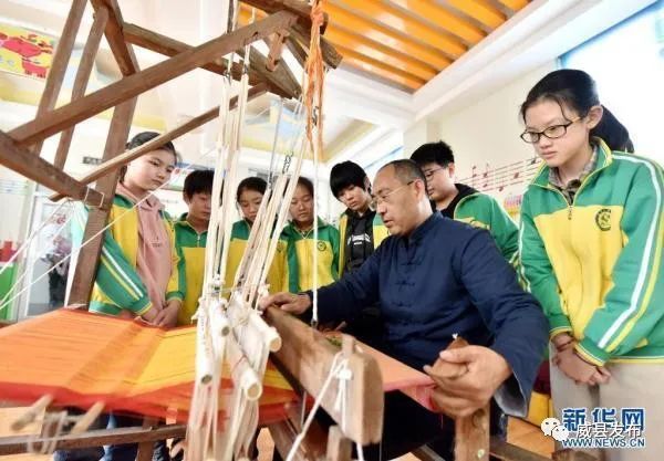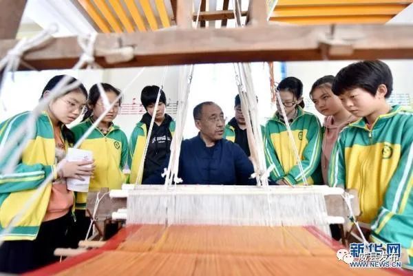 4月7日,威县土布纺织技艺传承人高庆海在威县第四小学向学生演示老粗布纺织技艺。