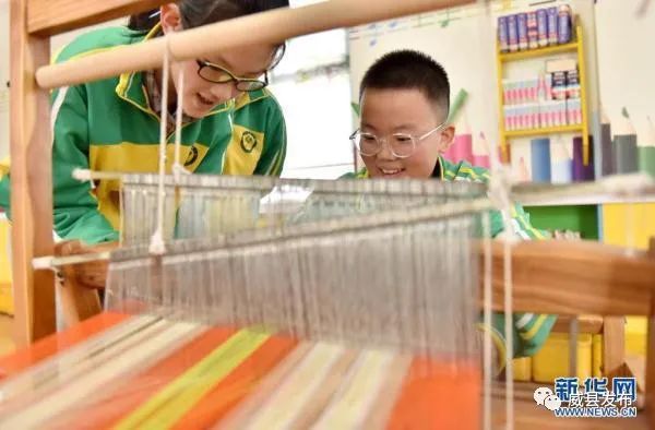 4月7日,威县第四小学学生在体验老粗布纺织技艺。