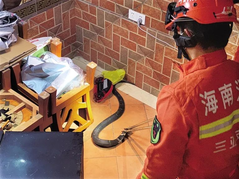 连日来,三亚消防共接到24起蛇扰民求助。图为消防救援人员在对溜进居民家的蛇进行处置。