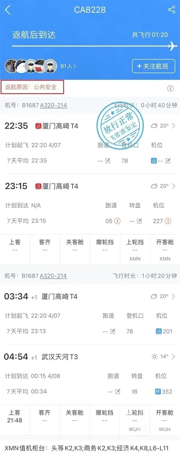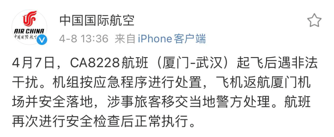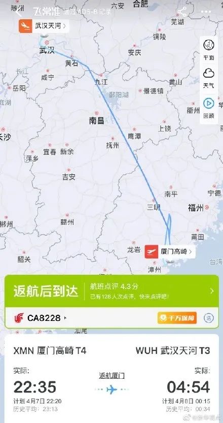 4月7日晚,中国国际航空CA8228航班在执飞厦门—武汉航程时,因公共安全原因,紧急返航厦门(手机截图)