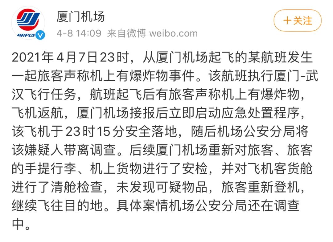 另据@厦门机场:2021年4月7日23时,从厦门机场起飞的某航班发生一起旅客声称机上有爆炸物事件。该航班执行厦门-武汉飞行任务,航班起飞后有旅客声称机上有爆炸物,飞机返航,厦门机场接报后立即启动应急处置程序,该飞机于23时15分安全落地,随后机场公安分局将该嫌疑人带离调查。后续厦门机场重新对旅客、旅客的手提行李、机上货物进行了安检,并对飞机客货舱进行了清舱检查,未发现可疑物品,旅客重新登机,继续飞往目的地。具体案情机场公安分局还在调查中。