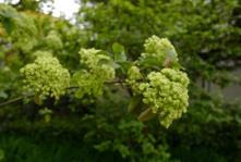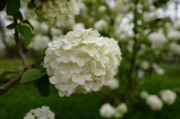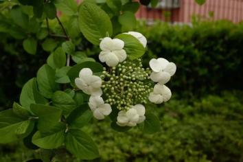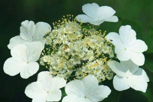 从花朵形状看,琼花为扁平状,像个盘子,四周为不孕花,绣球荚蒾与名称相符成球状,均为不孕花。