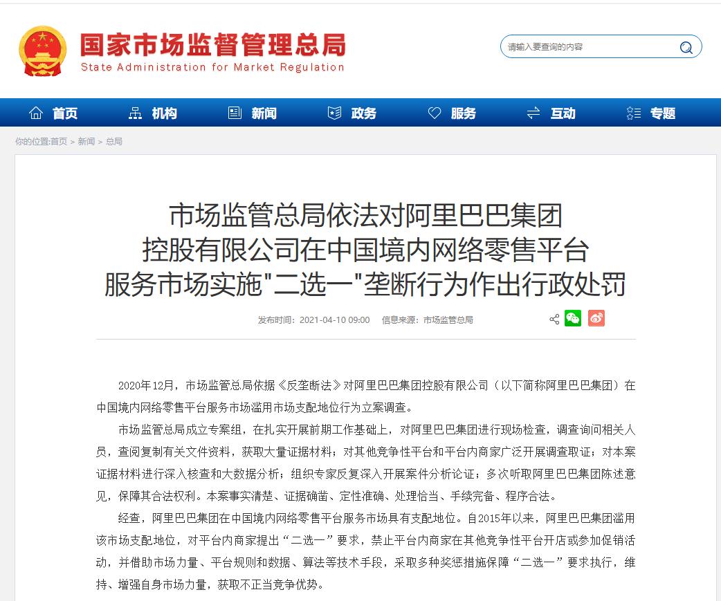2020年12月,市场监管总局依据反垄断法对阿里巴巴集团控股有限公司(以下简称阿里巴巴集团)在中国境内网络零售平台服务市场滥用市场支配地位行为立案调查。