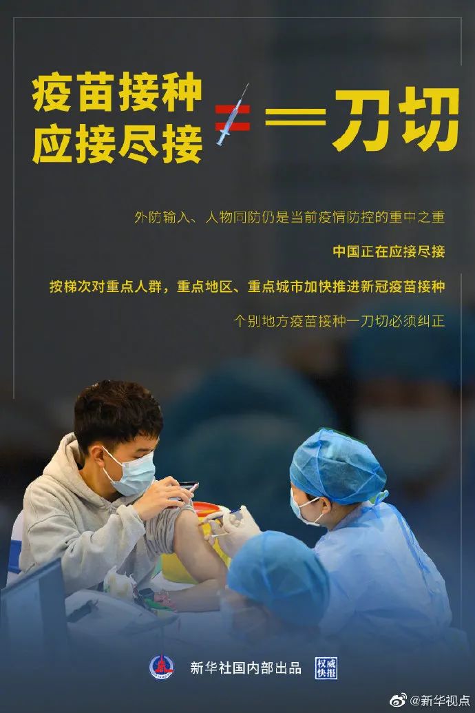 近期,全球疫情再次反弹,我国边境城市瑞丽出现了聚集性疫情,提示外防输入、人物同防仍是当前疫情防控的重中之重。接种疫苗是防控疫情的有效手段。我国目前正在应接尽接、按梯次,对重点地区、重点人群、重点城市加快推进新冠疫苗接种。截至4月10日24时,全国累计报告接种新冠疫苗16447.1万剂次。近期,个别地方接种工作中出现了简单化,甚至一刀切的情况,强制要求全员接种,必须坚决予以纠正。