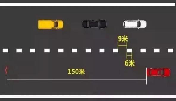如上图所示,路面中间的白色虚线(6米)加一个空格(9米)为15米,所以当高速公路上需要将三角警示牌摆放在150米处时,只需要走十格左右就可以了。
