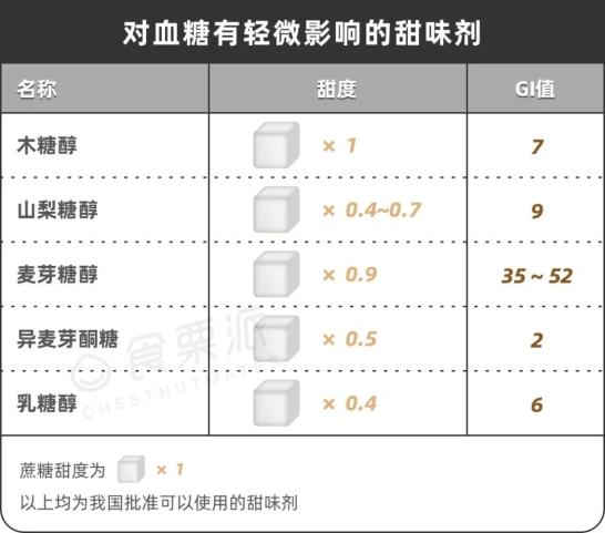 另一种是「营养性甜味剂」,有一定热量,对血糖也有一定的影响。比如前面提到的糖醇类甜味剂。