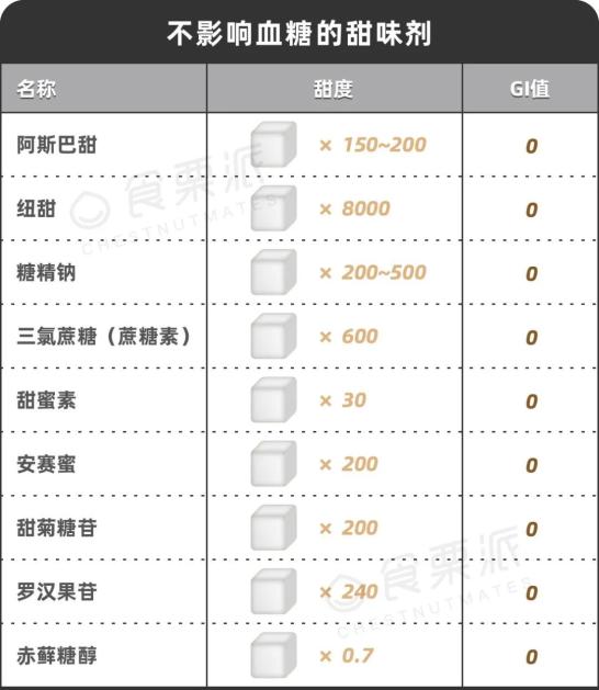 一种是「非营养性甜味剂」,指蔗糖素等不含热量的高倍甜味剂,几乎没有热量,不影响血糖。