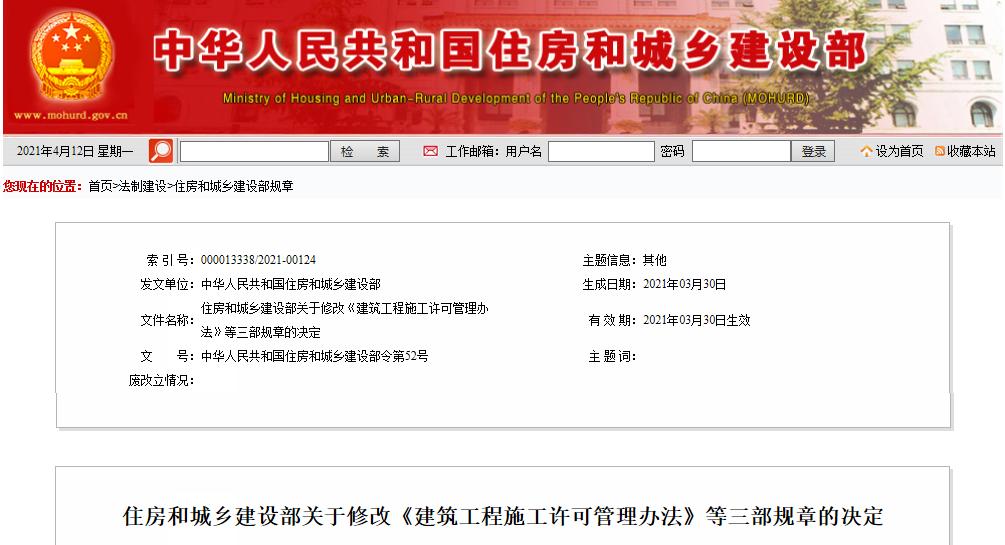 近日,住建部发布了关于修改《建筑工程施工许可管理办法》等三部规章的决定。