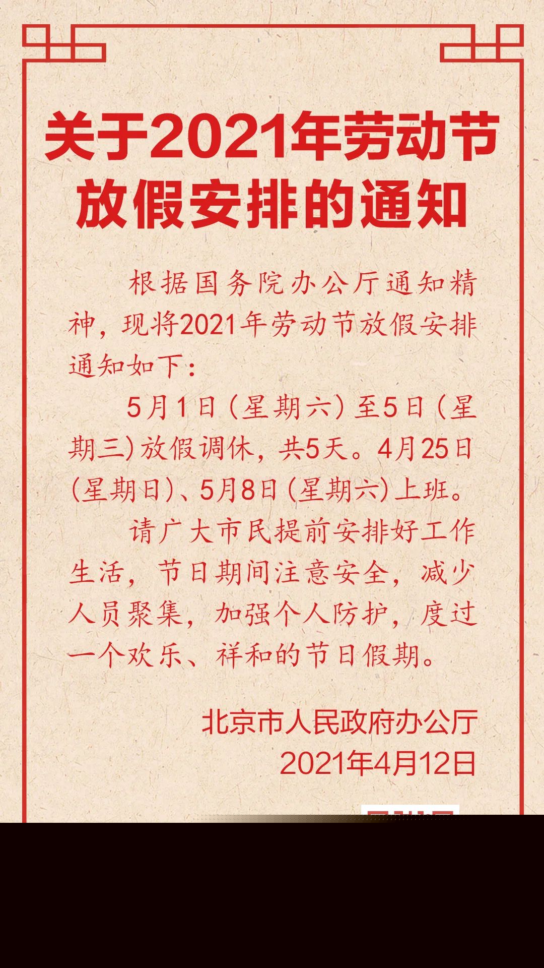 4月12日,据北京市人民政府办公厅消息,根据国务院办公厅通知精神,现将2021年劳动节放假安排通知如下: