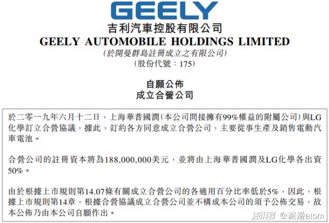 国内车企方面,2017年,吉利汽车全资收购了LG南京电池工厂,并获得了后者所有生产设备和制造技术知识产权的使用权;2018年底,吉利汽车80亿元动力电池项目落户湖北荆州;2019年6月,吉利汽车还发布公告称附属公司上海华普国润将与LG化学成立合资公司,注册资本为1.88亿美元,双方各出资50%。