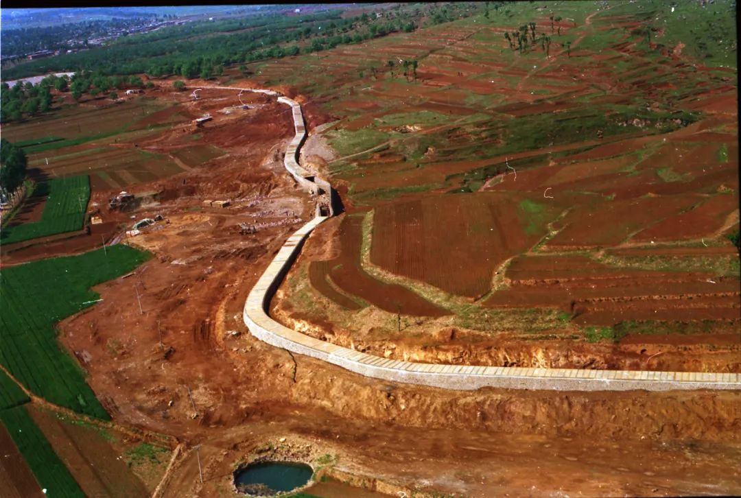 1990年5月20日航拍的引青西线盖板涵、拱涵工程。