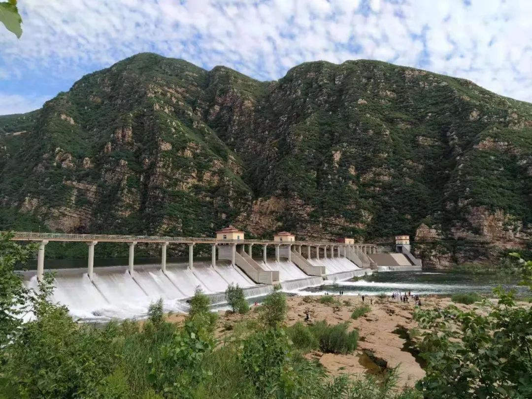 总长340米的溢流坝横亘于寂静的山坳之间,坝后水面开阔,在满山枯黄的映衬之下,澄净的河水犹如一颗碧绿的宝石,与湛蓝的天空交相辉映。河水自此分开,一部分继续沿河道流向下游,另一部分引入小黄崖隧洞。自小黄崖隧洞处,河水再次一分为二,一部分经由卢龙引青灌渠流向万亩良田,另一部分经渠首取水闸奔赴城区。
