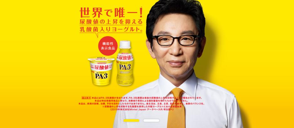 随后明治推出了可以预防感冒及流感的R-1酸奶;2015年,明治又推出了PA-3酸奶,这是世界首款具有降低尿酸值功效(高尿酸血症可能诱发痛风)的乳酸菌产品。