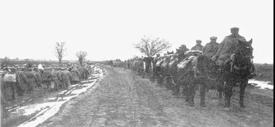 淮海战役中人民解放军凯歌行进,大批国民党军队俘虏被押下战场