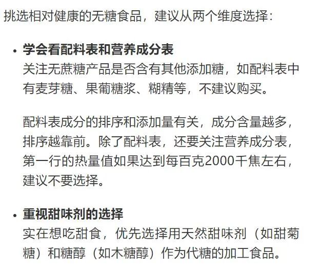 所谓的“0蔗糖酸奶”“无蔗糖饼干”等,其实可能含有麦芽糖浆、麦芽糊精等成分,同样可升高血糖,且升高血糖的效率比蔗糖还高,不利于控制血糖。