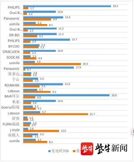 此外,样品噪声差异较大,最大噪声与最小噪声的差值约为25分贝。样品的充电、放电时间差别也很悬殊,实际充电时间最短为1.4小时,最长为29.5小时。测试样品最长放电时间为21.7小时,最短放电时间仅为0.7小时。部分样品牙刷刷柄上,使用档位或警示信息没有用中文标注,这对于一些使用者容易造成误用,或者无法起到应有的安全警示作用。