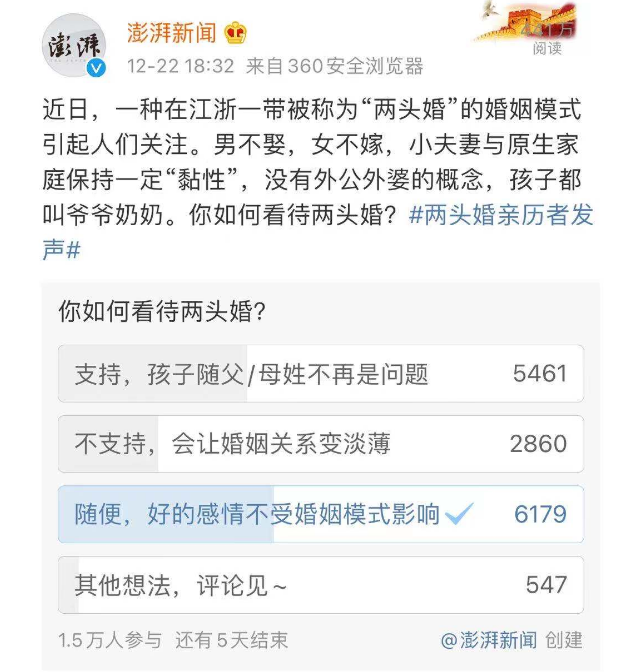 “两头婚”的婚姻模式,即男不娶、女不嫁,小夫妻与原生家庭保持一定“黏性”,没有外公外婆的概念,孩子都叫爷爷奶奶。澎湃新闻2020年末曾在微博发起过关于“两头婚”的投票,超过七成的网友并不反对这样一种婚姻模式。