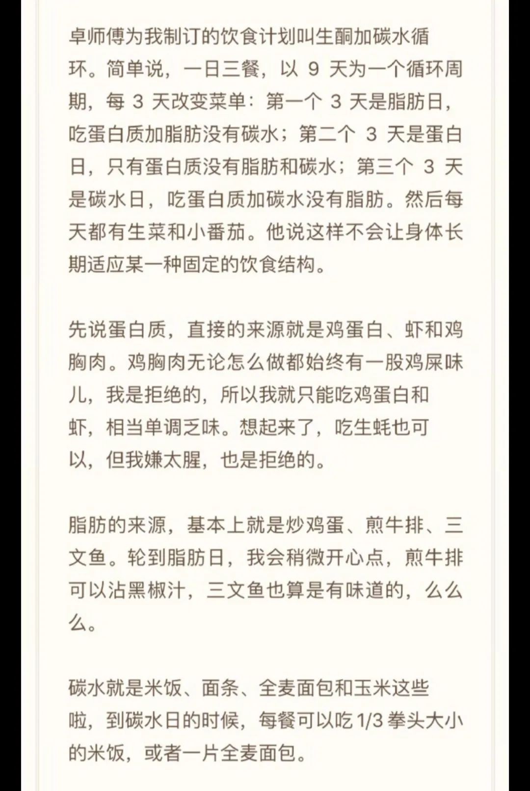 19年大鹏为拍摄电影《第八个嫌疑人》,一个多月瘦30斤,三个多月累计减重50斤,用的也是生酮+碳水循环,以9天为一个循环周期,每三天改变餐单,按脂肪日、蛋白日和碳水日循环,脂肪来源主要是炒鸡蛋、煎牛排、三文鱼。