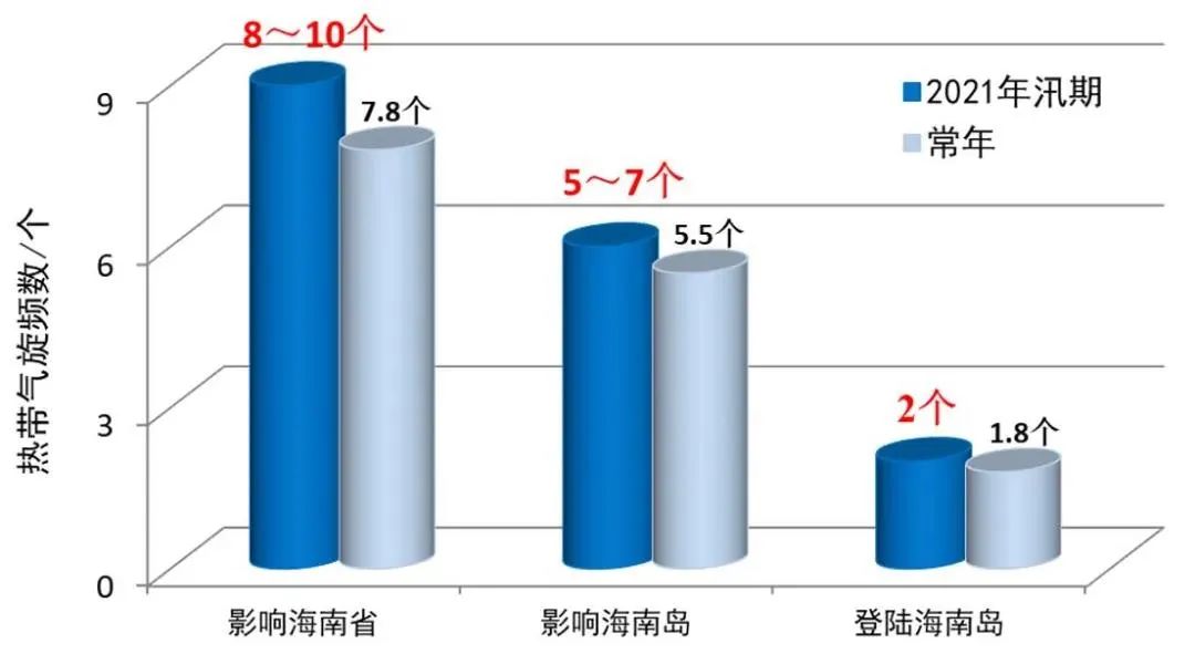 热带气旋:预计2021年汛期(5~10月),影响海南省的热带气旋(含热带低压、热带风暴、强热带风暴、台风及台风以上强度的热带气旋)为8~10个(常年7.8个),其中影响海南岛的为5~7个(常年5.5个),登陆海南岛的为2个(常年1.8个),影响和登陆个数接近或多于常年。影响和登陆海南省的热带气旋强度总体接近常年,但期间可能会出现个别较强台风影响。热带气旋灾害总体略重于常年。