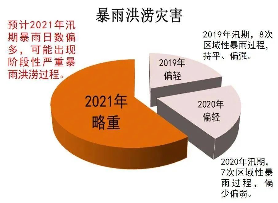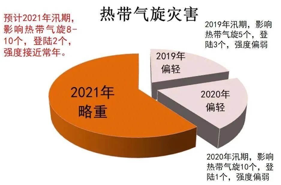 预计2021年汛期,海南省热带气旋和暴雨洪涝灾害将重于2019年和2020年,气象干旱和高温灾害轻于2019年和2020年。气候状况将差于2019年和2020年。