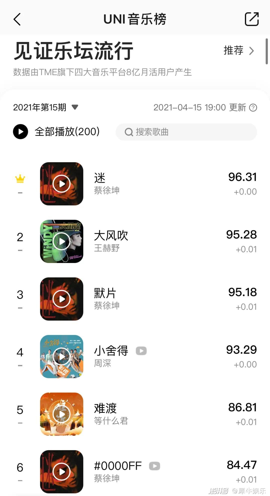 在TME旗下QQ音乐平台上,《迷》以1小时56分神速刷新平台「史诗唱片」、「白金史诗唱片」、「殿堂史诗唱片」3项历史记录!目前,专辑释出的3首歌曲《迷》《默片》《#000FF》也均已闯入由你音乐榜实时Top10,《迷》的综合得分更高达96.31分,助推蔡徐坤登顶歌手实时榜第一!