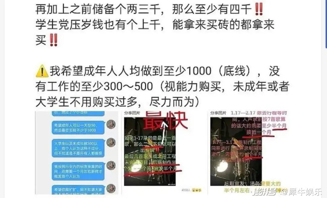 毫无疑问,集资对于粉丝群体来说风险极高,常常是智商税。不搞集资,但蔡徐坤粉头们还是采用了更另类的手段来支持偶像发片——“呼吁存钱买砖”,只等今年发片那天买量助力,并喊出“首日销售破7(7千万)冲8(8千万)”的销量目标。